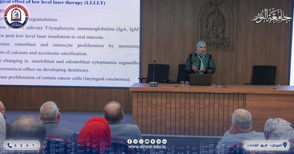 نظمت كلية طب الأسنان في جامعة النور صباح يوم الأحد الموافق 2025/10/19 لقاءً علمياً تناول استخدام الليزر الواطئ في علاج
